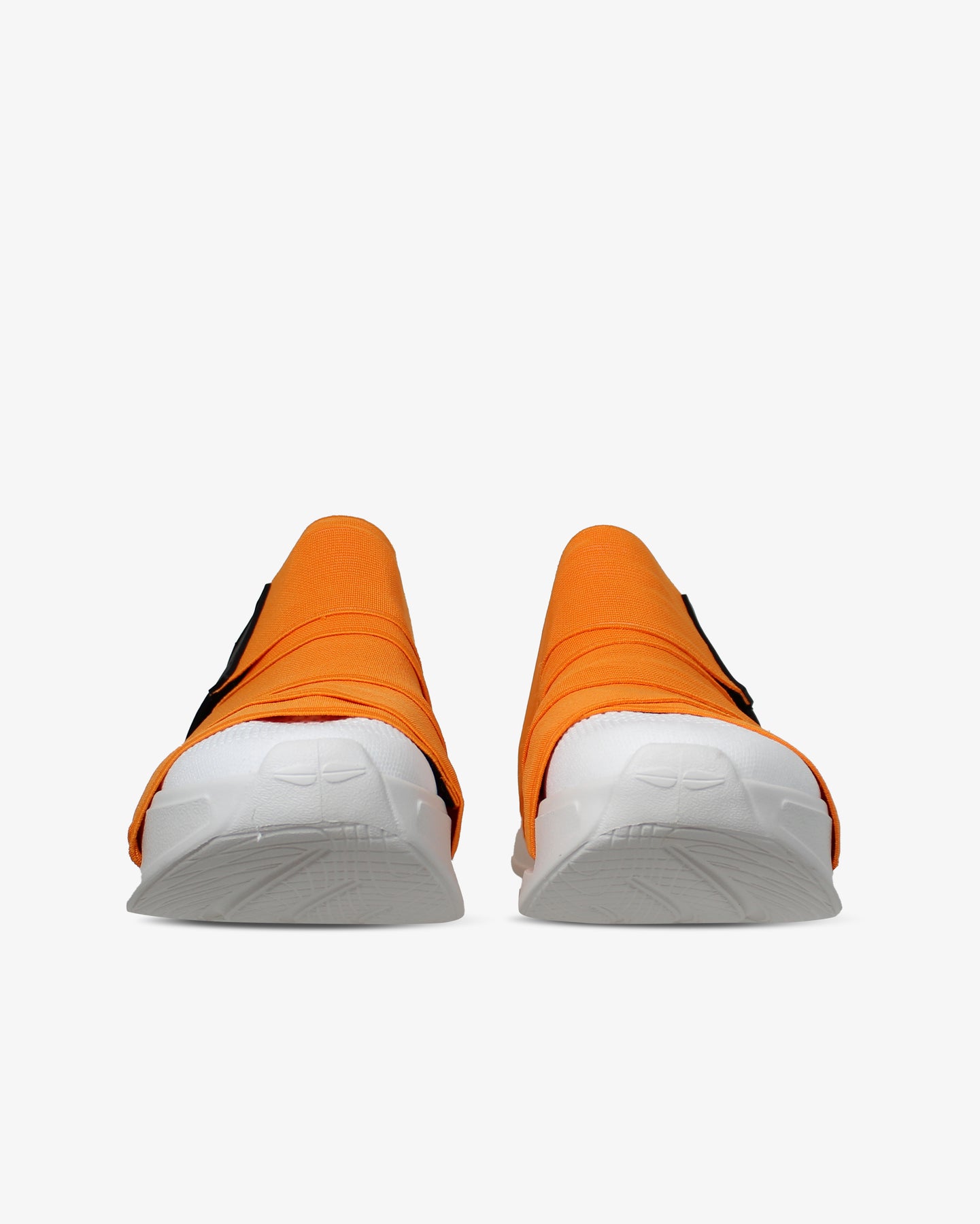 Tomaia elastica di colore arancione resistente e avvolgente. Apertura e chiusura con velcro in gomma. La mancanza del procedimento di montaggio industriale riduce l’emissione di Co2 (-50%).