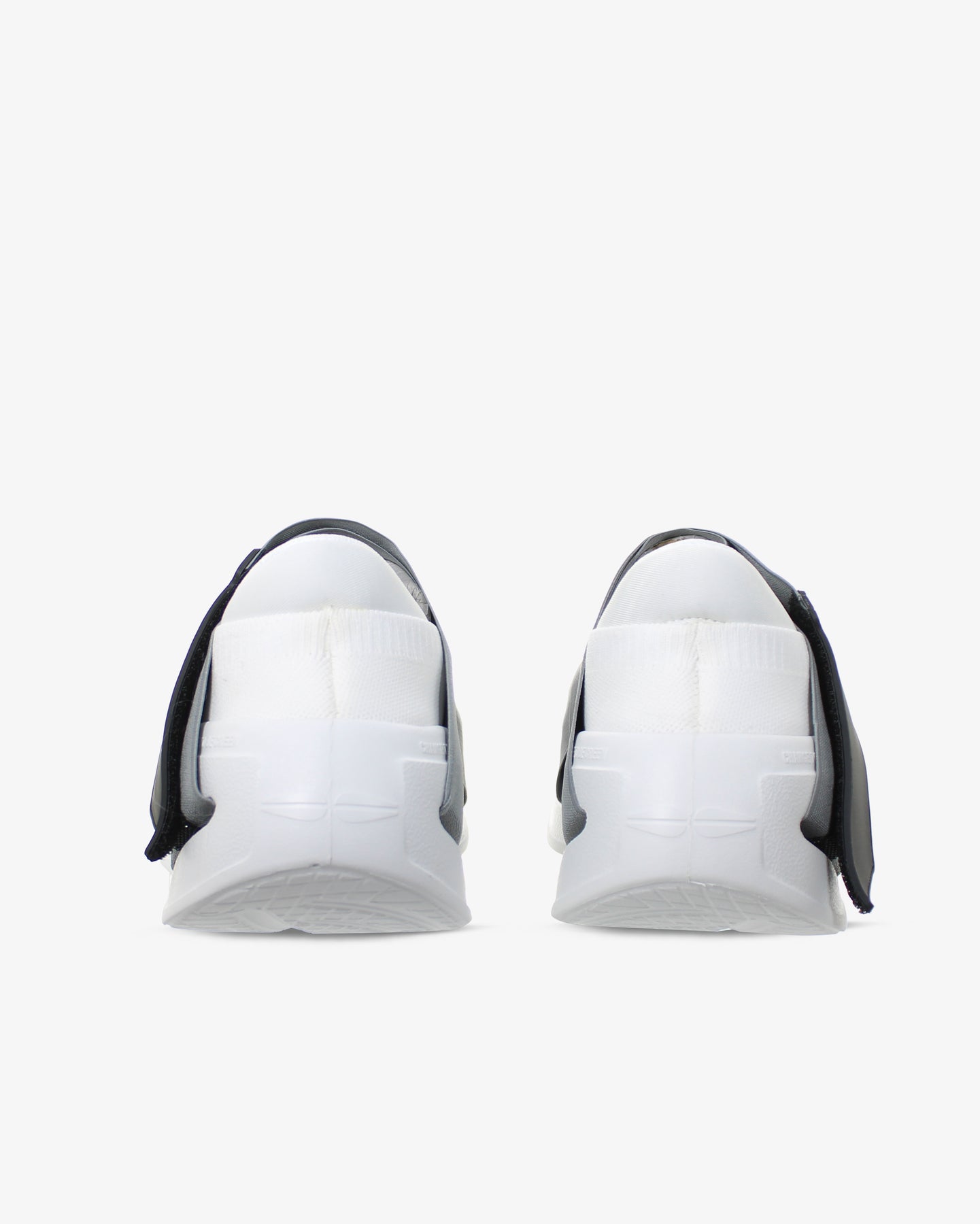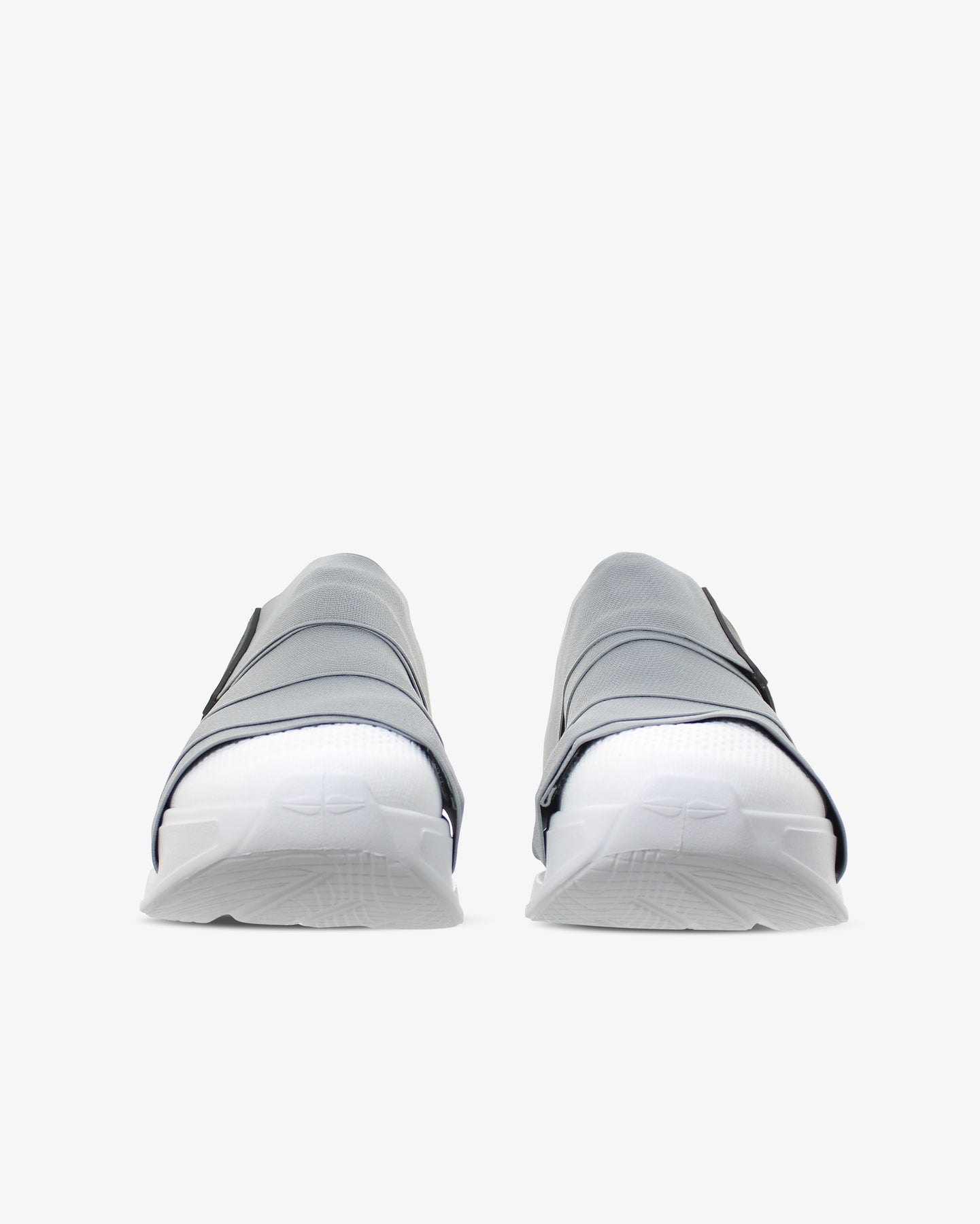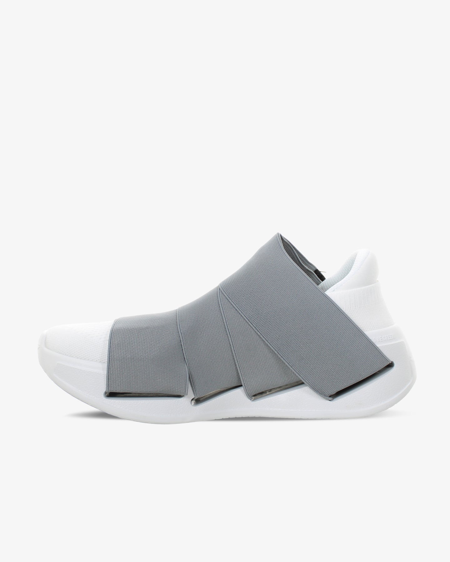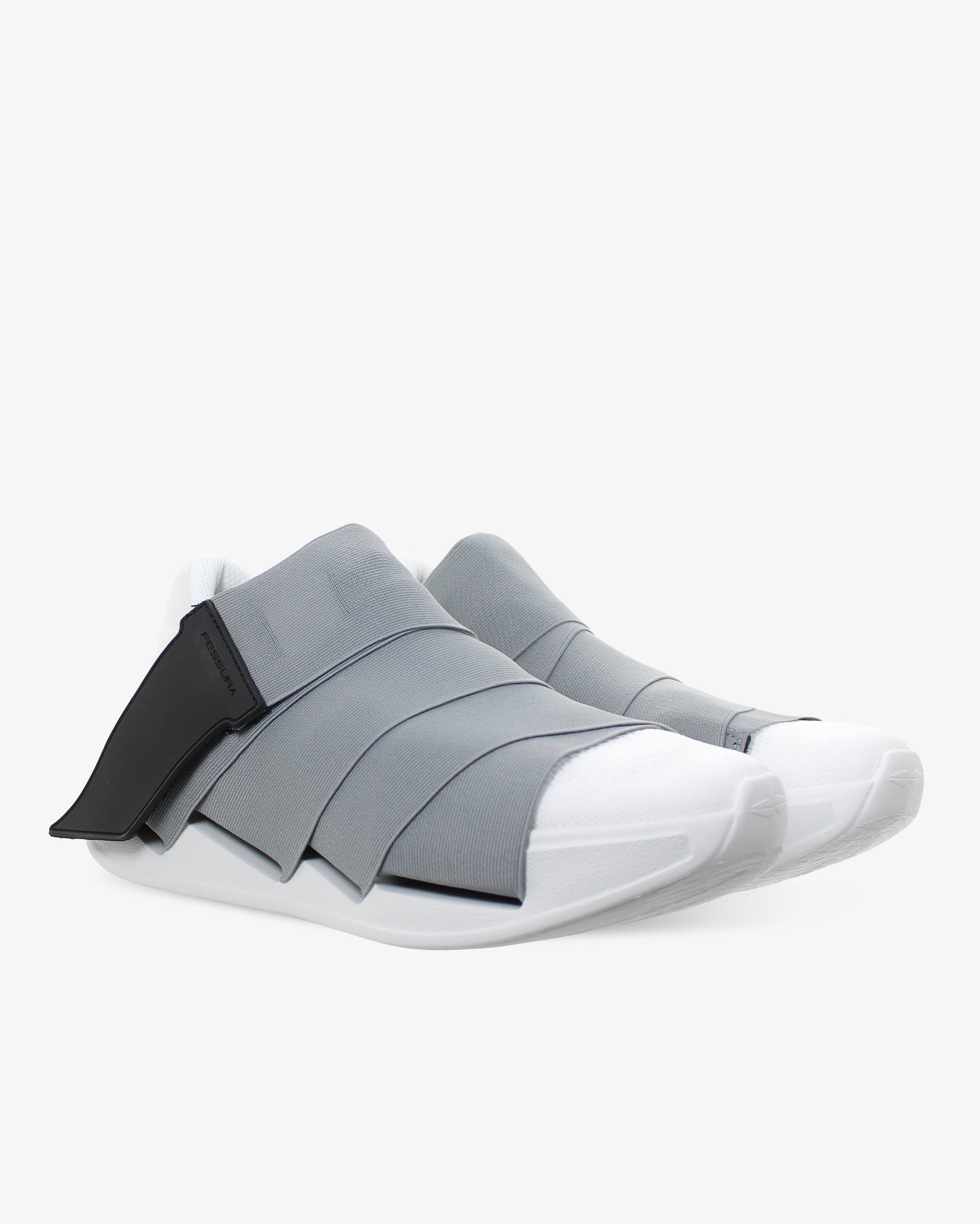 Tomaia elastica di colore grigio resistente e avvolgente. Apertura e chiusura con velcro in gomma. La mancanza del procedimento di montaggio industriale riduce l’emissione di Co2 (-50%).