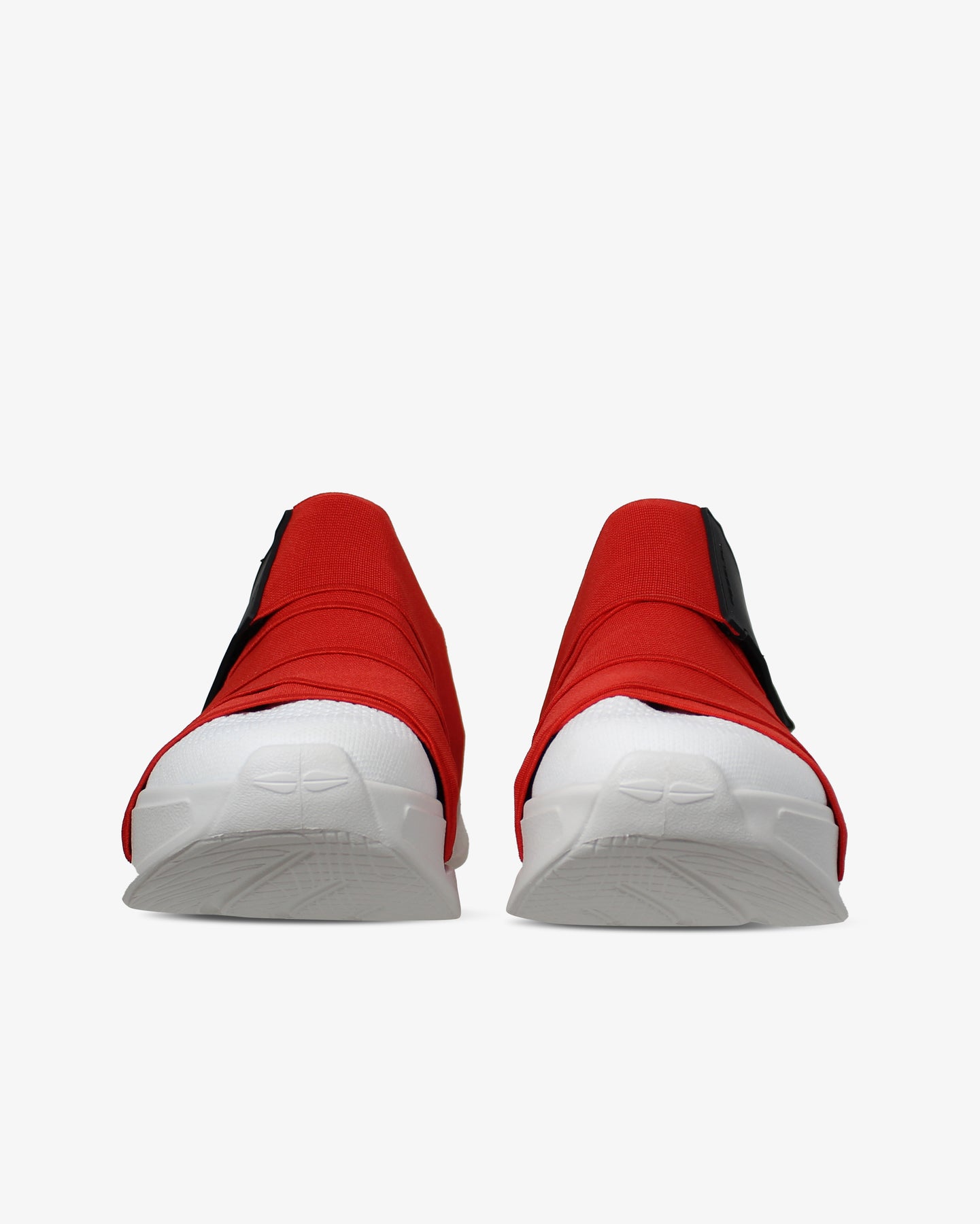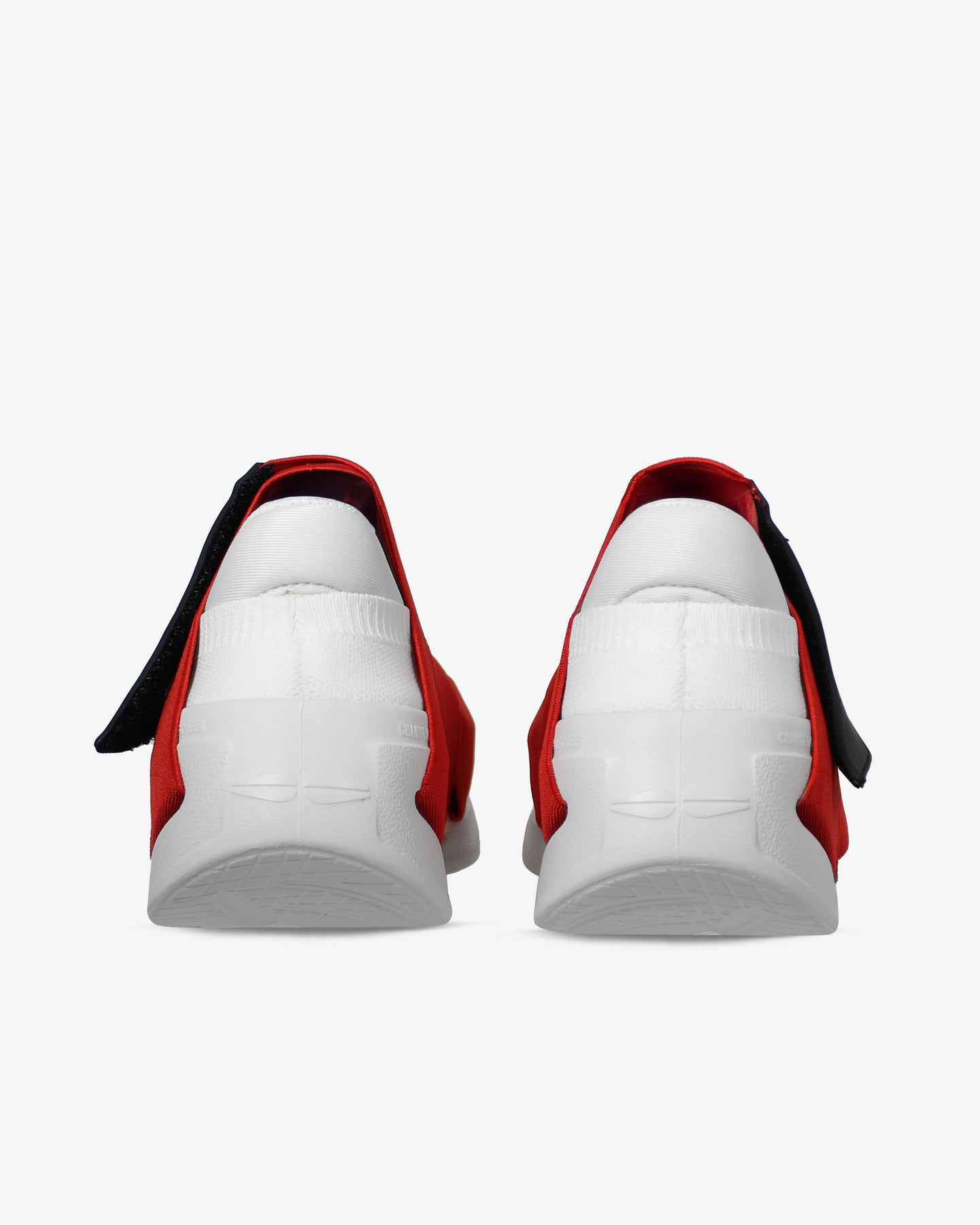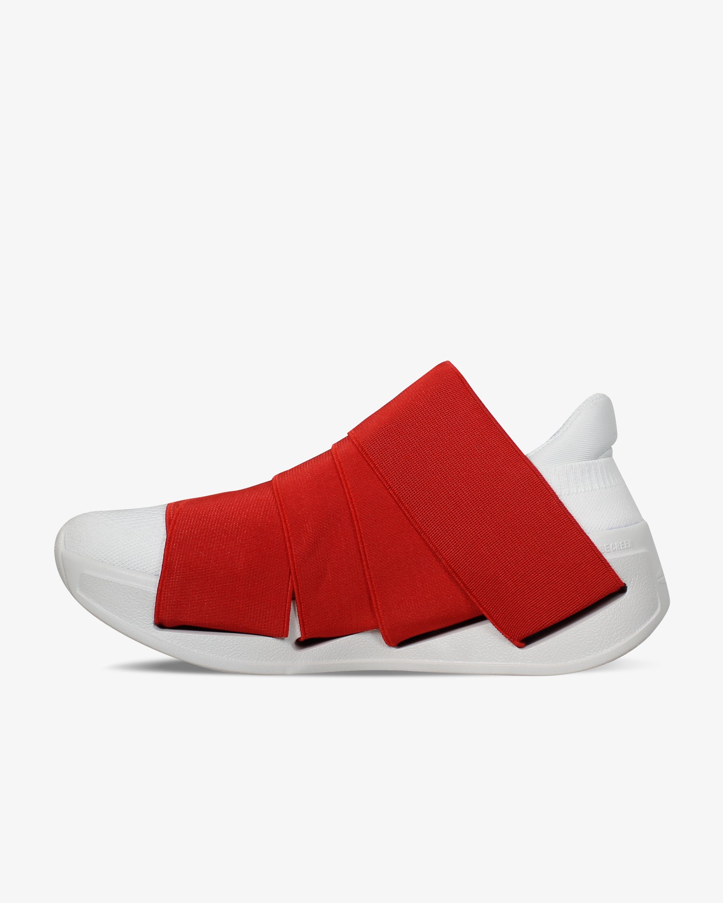 Tomaia elastica di colore rosso resistente e avvolgente. Apertura e chiusura con velcro in gomma. La mancanza del procedimento di montaggio industriale riduce l’emissione di Co2 (-50%).