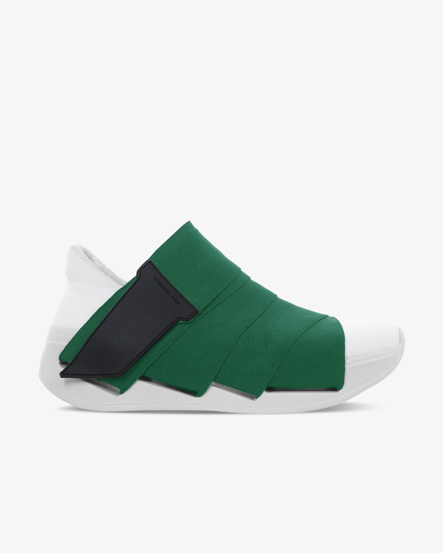 Tomaia elastica di colore verde resistente e avvolgente. Apertura e chiusura con velcro in gomma. La mancanza del procedimento di montaggio industriale riduce l’emissione di Co2 (-50%).